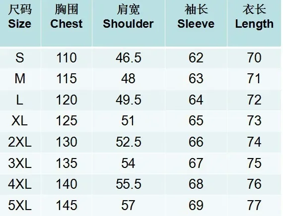 5XL =Bust 145cm , Length 77cm, Sleeve 69cm ,For Weight 120-130kg;